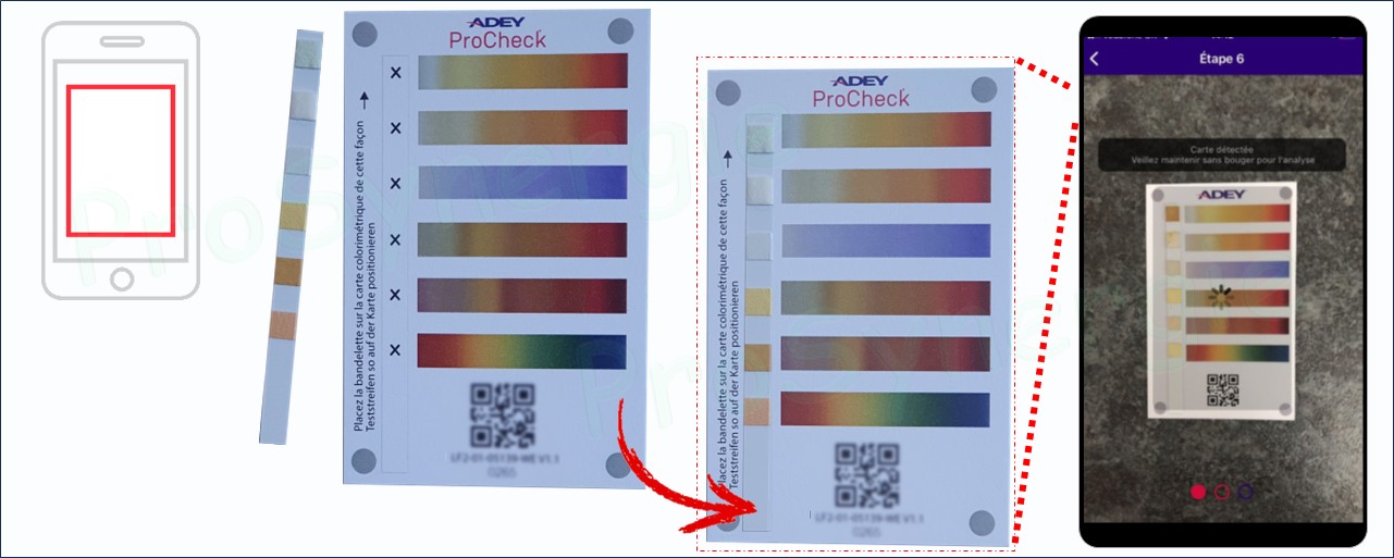 Sortir le bâtonnet de test du tube et le placer sur la carte de test pré-payée à l'emplacement prévu. Ouvrir l'application ADEY ProCheck (disponible sur App Store et Google Play) et scanner la carte. Le laboratoire distant Adey fournit immédiatement et automatiquement le résultat, moyennant un délai de traitement d'environ 3 minutes.