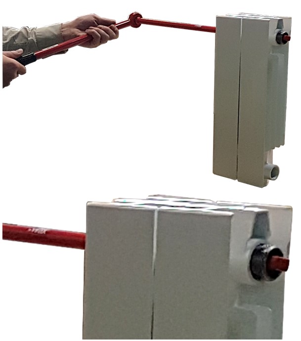 Une fois la tête de la barre arrivée un niveau de la nipple, elle peut être agrippée et dévissée. L'opération doit être répétée en haut et en bas du radiateur, afin de pouvoir séparer les éléments, ainsi que le montre cette illustration :