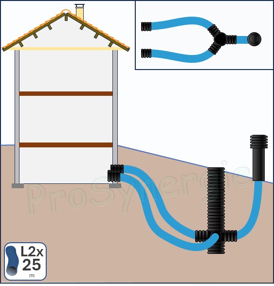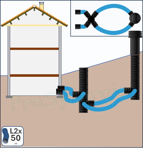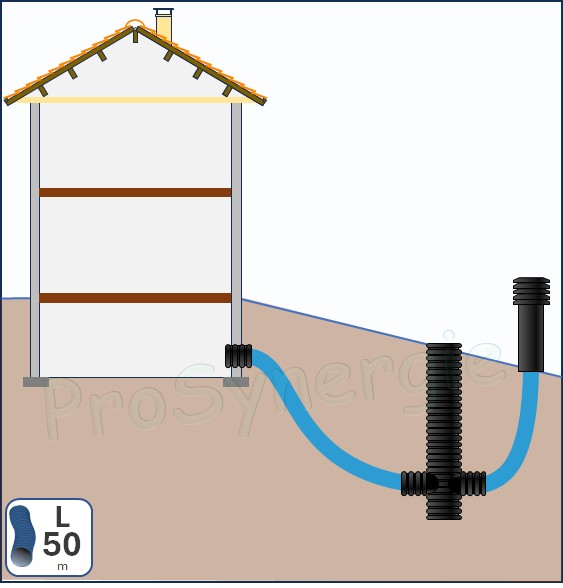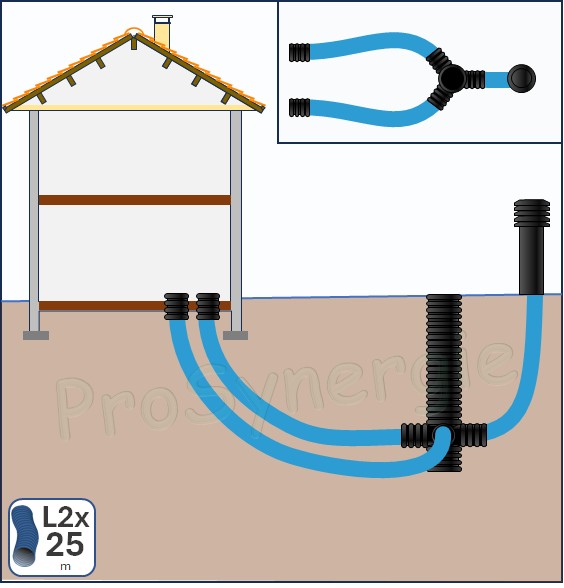 En fonction de la configuration de la maison (avec ou sans sous-sol) et du terrain (en pente vers la maison ou à l'opposé, ou horizontal), il sera nécessaire de prévoir un regard sur le parcours. Pour de petits terrains, ou de gros débits d'air, le tuyau échangeur sera doublé, etc... Vous trouverez ci-dessous un aperçu des différentes possibilités sous forme de schémas.