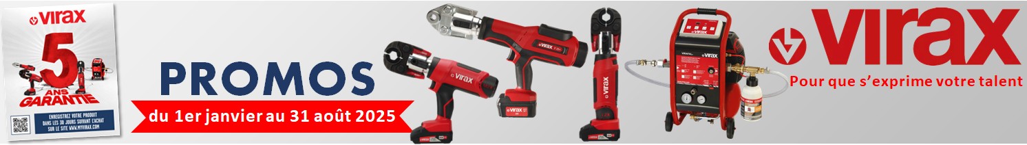 Extention de la garantie jusqu'à 5 ans pour les sertisseuses M2X, L2X et P25, ainsi que les désemboueuses Virafal pour tout achats du 1er janvier au 31 août 2025 (voir conditions sur le feuillet promotionnel Virax en cliquant sur le bandeau ci-dessus).