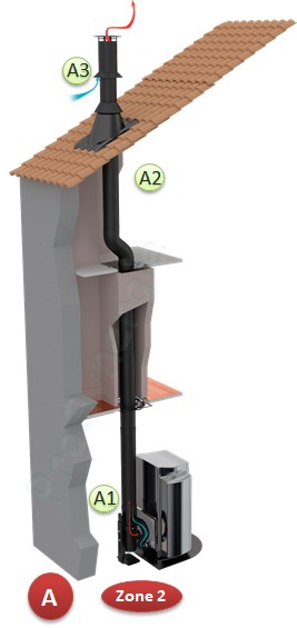 ![]() | A3 : Sortie toiture verticale (terminal) en Zone 2 A2 : Montée dans la pièce de chauffe, traversée des planchers, étages et / ou combles (écart au feu de 10 cm à respecter) A1 : Raccordement à l'arrière du poêle (ou au-dessus) des fumées et de l'apport d'air comburant |