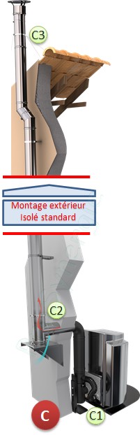 ![]() | C3 : Conduit double paroi isolé classique en montage extérieur (selon DTU 24.1). C2 : Raccordement sur conduit de fumée isolé double paroi pour la partie fumée et prise d'air. C1 : Raccordement à l'arrière du poêle (ou au-dessus) des fumées et de l'apport d'air comburant. |