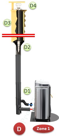 ![]() | D4 : Terminal (avec prise d'air et sortie de fumée) en Zone 1. D3 : Souche de cheminée préfabriquée avec tubage isolé double paroi et flexible. D2 : Raccordement sur conduit de fumée isolé double paroi intérieur 230 / extérieur 280 mm : D1 : Raccordement à l'arrière du poêle (ou au-dessus) des fumées et de l'apport d'air comburant. |