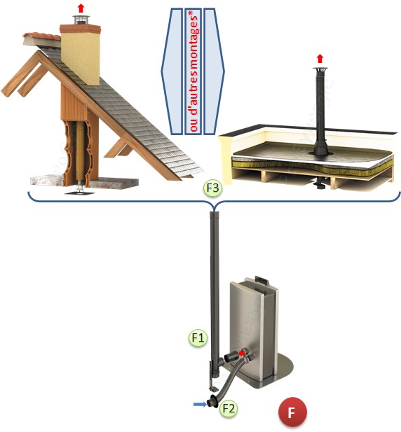 ![]() | F3 : Raccordement des fumées selon montage habituel, en fonction du type de construction, selon DTU 24.1 (voir * sur le schéma). F2 : Prise d'air extérieure (passage mural ou sol). F1 : Raccordement des fumées. |