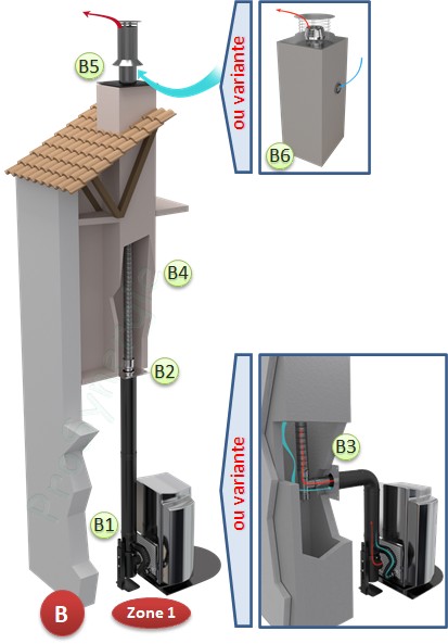 ![]() | B6 : Idem B5 mais prise d'air sur la maçonnerie B5 : Terminal sur souche de cheminée en Zone 1. B4 : Tubage du conduit de cheminée. B3 : Idem B2, mais raccordement sur un té de tubage. B2 : Raccordement du conduit concentrique sur le conduit de cheminée existant B1 : Raccordement à l'arrière du poêle (ou au-dessus) des fumées et de l'apport d'air comburant |