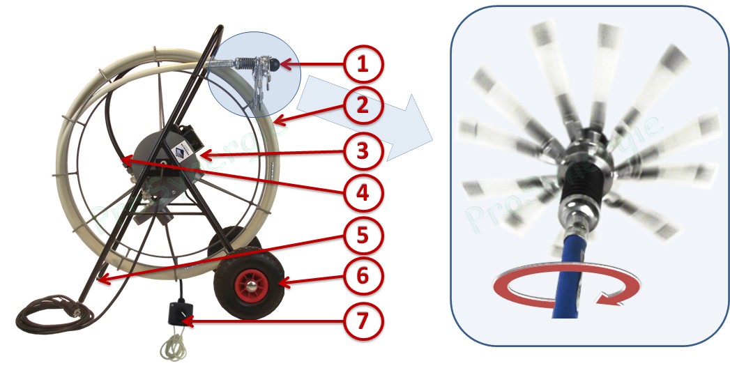 | Le moteur entraînant le câble rotatif doit être puissant (220 Volts CV 1500 t/mn ???????) afin d’assurer une rotation efficace, mais il doit être muni d’un embrayage en cas de blocage de la tête (dans un bouchon, par exemple), afin de ne pas détériorer le câble. | ![]() |