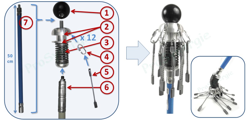 La tête du Rotonet Roue est conçue pour monter 12 mousquetons et 12 câbles. Elle est flexible pour s’adapter aux différentes configurations dans les conduits de fumée.