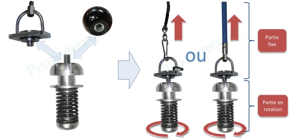 Après avoir été dévissée la boulle de la tête du Rotonet Roue, peut être remplacée par une Manille avec roulement, afin de guider la tête par le haut du conduit au moyen d’une corde ou de cannes de ramonage.