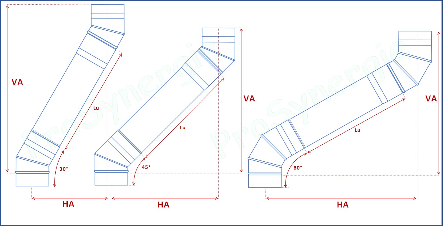 Dévoiement avec 2 coudes de 30, 45 ou 60°et différentes longueurs intercalées de tuyaux de poêle émaillés