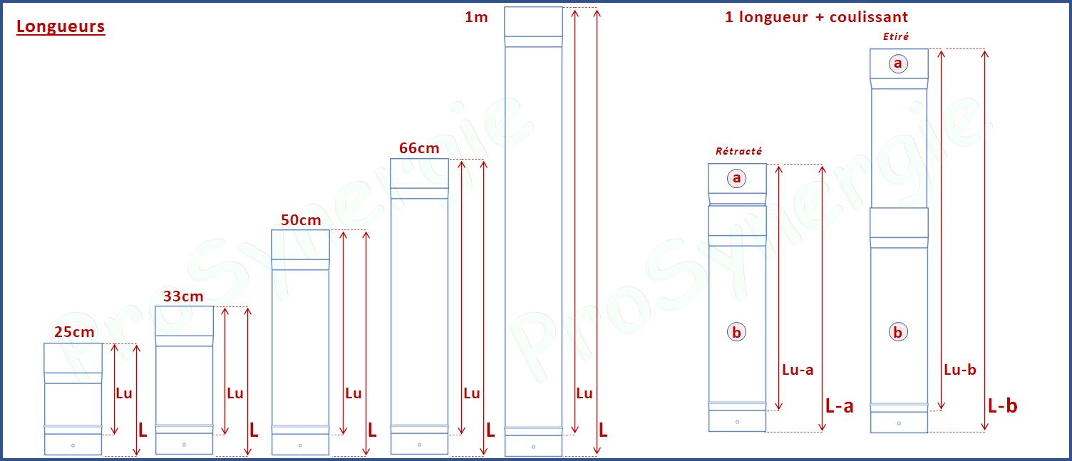 Cotes (Lu - Longueur utile) pour un assemblage d'un tuyau émaillé coulissant de 50cm et un tuyau émaillé d'une longueur de 33, 50, 66 cm ou 1 m.